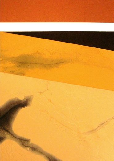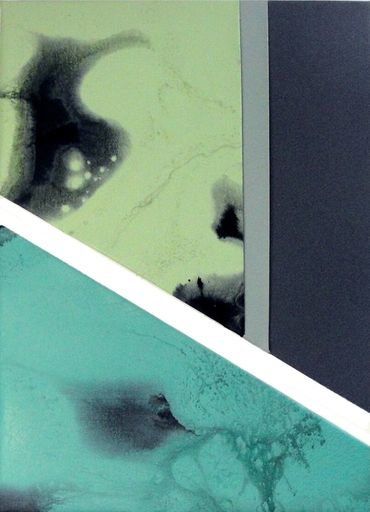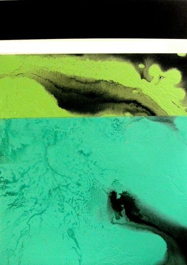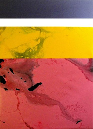 This abstract art series is about layer upon layer of primed and painted canvas. The canvas is folded, cut and formed around the sides and stapled to a wood panel. Each layer starts with a black background and poured paint. The individual pours are then put together according to their compatibility.