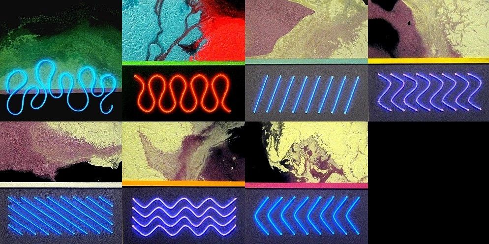 This series is made on wood panels with battery operated neon lights. Push buttons control the type of blinking light, steady, or pulsing light with on and off options.