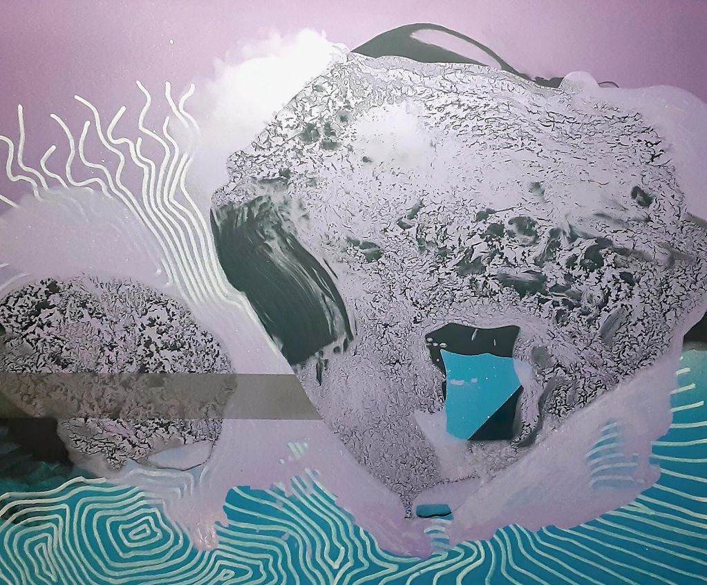 In contrast, the Ethereal Series seeks to break away from the rigidity and predictability of those graphic forms, embracing a more painterly and emotionally resonant approach. These non-representational paintings introduce fluidity and spontaneity, softening the structure of the previous works. The process begins with a solid, sprayed background on a 20x24 white paper board, providing a foundation for the dynamic layers that follow. A more fluid, risk-taking poured image defines the second layer, lending a sense of immediacy and unpredictability. The surrounding space is then filled with flowing, wave-like lines that extend to the borders, further enhancing the sense of movement and energy.
